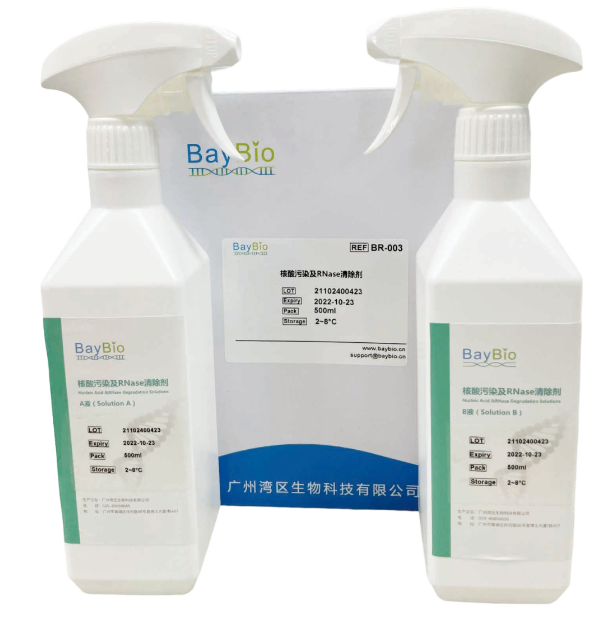 灣區生物核酸污染及RNase清除劑(貨號:BR-003)分為A液與B液, 液體本身均無毒,在混合后,會形成一種有效的、壽命短的混合液,以接觸方式起作用,迅速降解表面上的高水平污染DNA和RNA,以及RNase,可在數分鐘內去除多種表面的污染。
