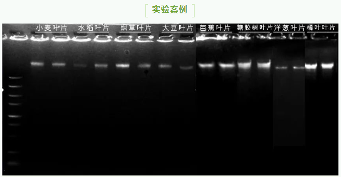 用灣區(qū)試劑盒按說明書對50mg植物樣本樣本進行DNA純化,條帶單一,清晰。